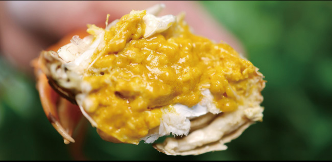 每逢炎夏,青母蟹會在產(chǎn)卵時棲身于淺灘河畔,在陽光的照射下,體內的蟹膏分解成金黃色的油脂,然后滲透到體內的各個部分,使得整只蟹晶瑩剔透、充滿黃油,因此被稱為黃油蟹。